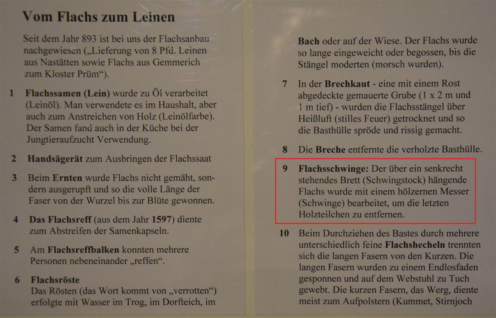 Im Museum „Blaues Ländchen“ in Nastätten können in einer speziellen Ausstellung die Arbeitsschritte der Leinenherstellung besichtigt werden.