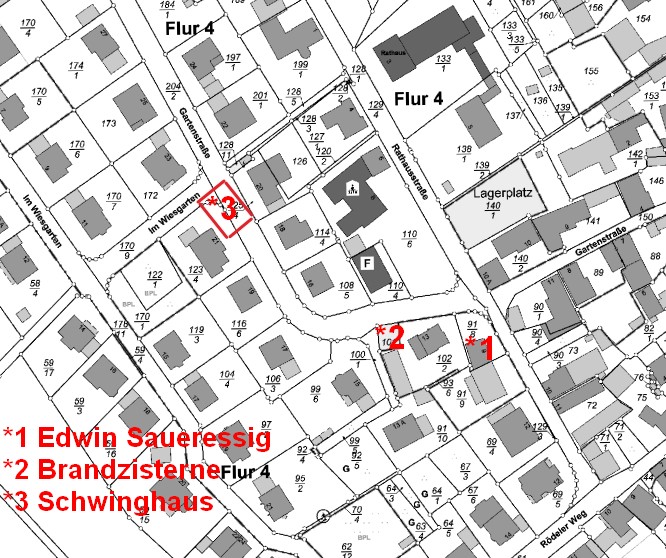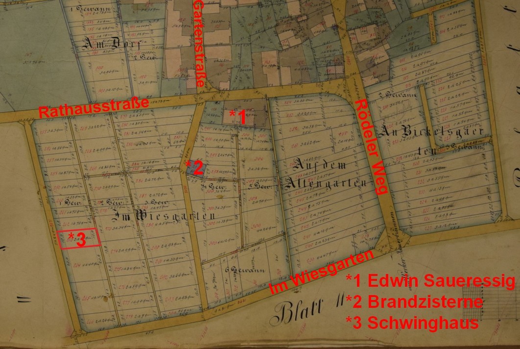 In den 1970er Jahren entstand im Wiesgarten das neue Baugebiet mit Neuvermessungen der Grundstücke und Wegebau, wobei sich das Schwinghaus ungefähr auf der eingezeichneten Fläche befunden hätte.