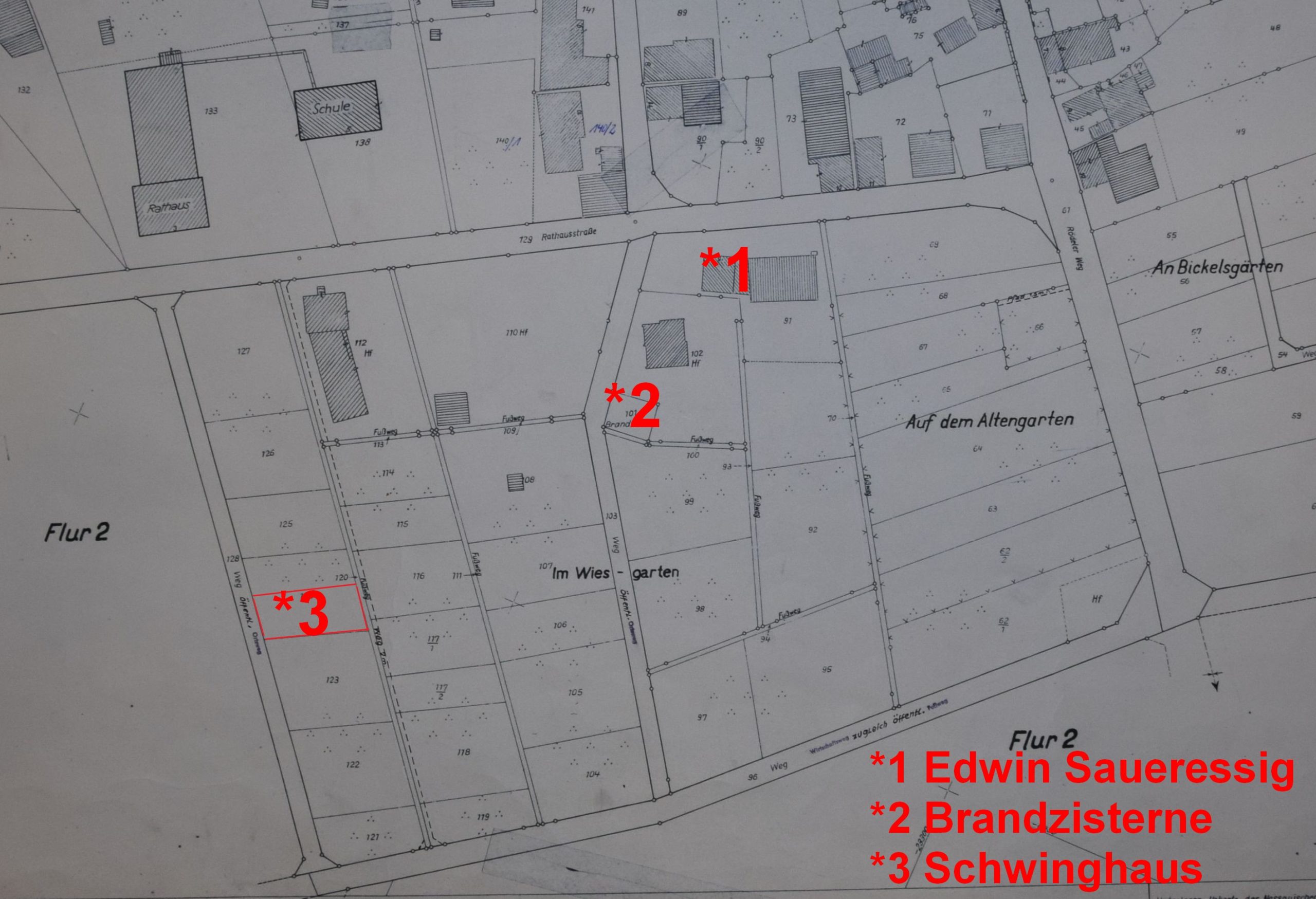 Die nach der Flurbereinigung in den Jahren 1958/59 zusammengelegten Parzellen bekamen neue Eigentümer. In diesem Fall hätte das Schwinghaus auf einem Teil des Flurstückes 124 gestanden.