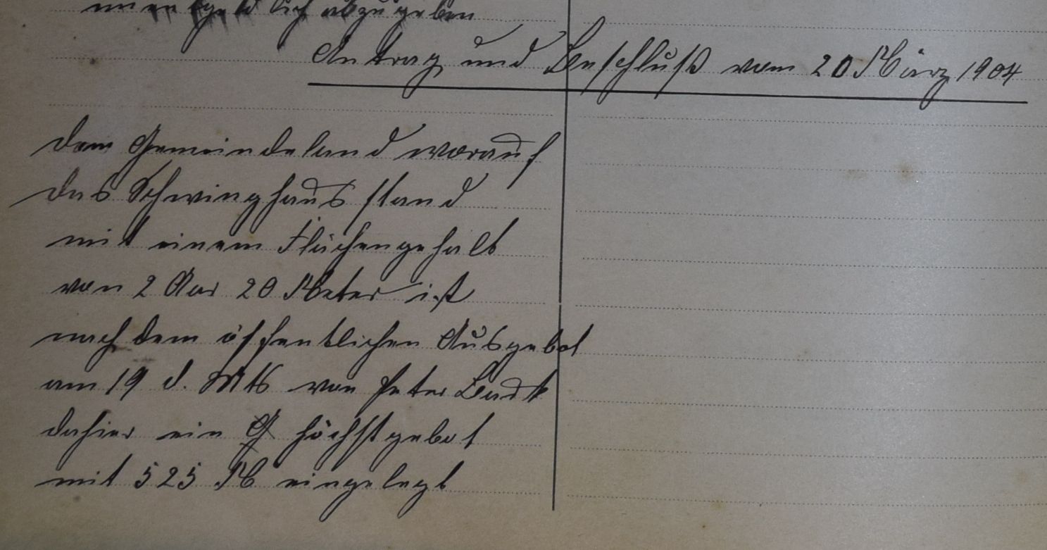 Dem Gemeindeland worauf das Schwinghaus stand mit einem Flächengehalt von 2 Aar 20 Meter ist nach dem öffentlichen Ausgebot am 19. d. Monats von Peter Back dahier ein Höchstgebot mit 525 Mark eingelegt.                                                                                    Antrag und Beschluss vom 20.März 1904