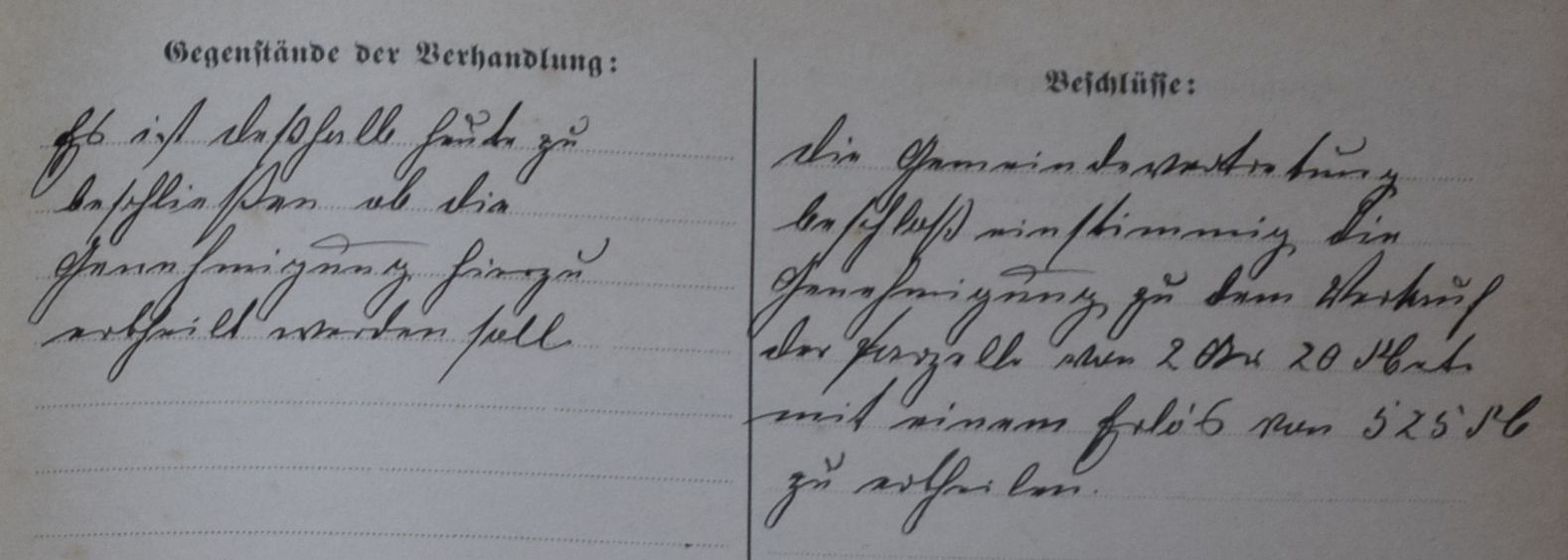 Die Gemeindevertretung beschloss einstimmig die Genehmigung zu dem Verkauf der Parzelle von 2 Aar 20 Meter mit einem Erlös von 525 M zu erteilen.