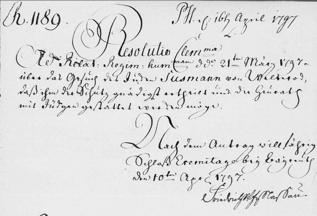 Genehmigungsurkunde (Schutz und Heirat) der Hofkammer Weilburg für Juden Süsmann von Welterod und Frau Jüdgen im April 1797. HHSTAW 152 1008