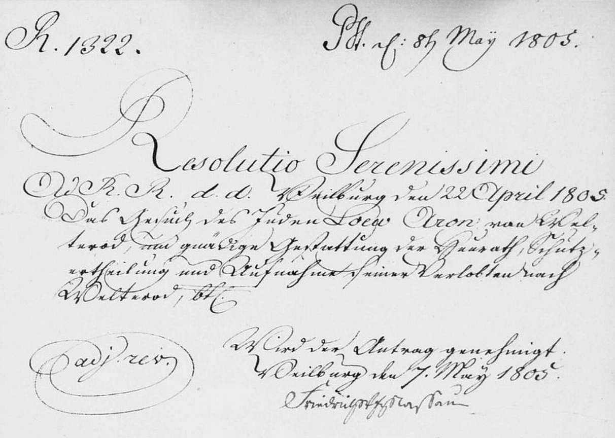 Genehmigungsurkunde (Schutz und Heirat) der Hofkammer Weilburg für Löw Aron von Welterod 7. März 1805 HHSTAW 152 1010 25