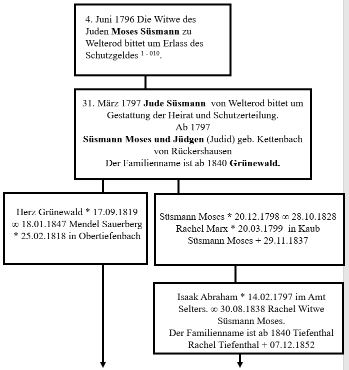 3. Jüd Süsmann senior +. Dessen zweite Witwe 64 Jahre und deren Töchter Breinel 23 Jahre und Jüdgen 20 Jahre, sie leben von Almosen, das Schutzgeld wurde per Dekret von Weilburg am 01. Juni 1802 erlassen.