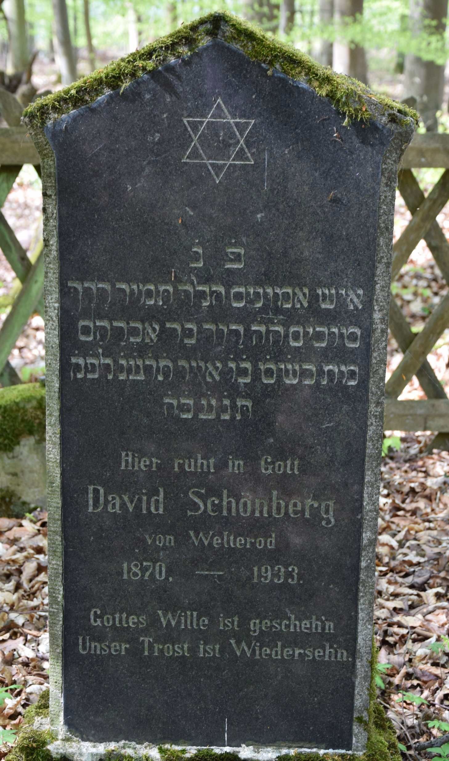 Einen Schicksalsschlag traf die Familie, als am 23. Mai 1933 David Schönberg bei der Feldarbeit plötzlich verstarb. Seine Beerdigung fand unter großer Beteiligung aller jüdischen Familien der Umgebung statt. Es war die letzte Bestattung eines Welteroder Bürgers nach mosaischem Ritus auf dem Friedhof bei Reitzenhain.