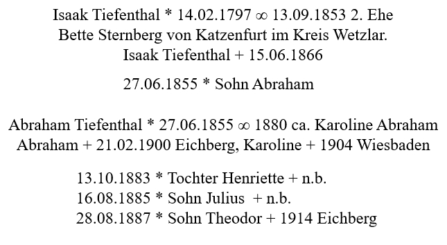 Die Händlerfamilie Tiefenthal besaß neben Wohnhaus und Scheune auch Feld und Gartengrundstücke, mit denen sie ein gutes Auskommen hatten. Als der Familienvater Abraham Ende der 1880er Jahre erkrankte und zeitweise in die Anstalt Eichberg überwiesen wurde, verarmten die Angehörigen. Sie betrieben zunächst noch einen Lumpenhandel. Tochter Henriette ging als Verkäuferin nach Frankfurt. Der Sohn Julius wurde Metzger in der Metzgerei Hirsch in Mainz. Das Haus musste verkauft werden und Karoline zog mit ihrem Sohn Theodor nach Wiesbaden, wo dieser eine Gärtnerlehre begann. Wegen Epileptischer Anfälle, die ab 1904 häufiger auftraten, überwies man ihn 1904 in die Anstalt Eichberg, in der er im Juni 1914 starb. Über das Schicksal seiner Geschwister ist nichts weiter bekannt.