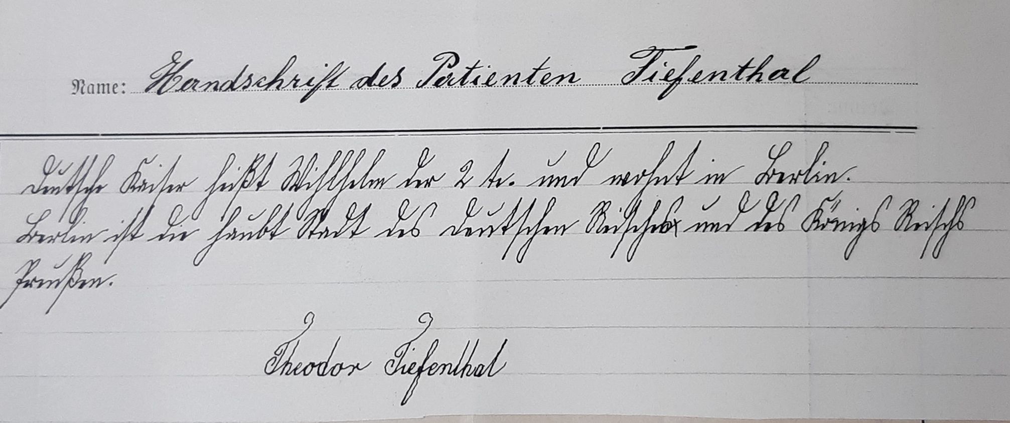 Die Handschriftprobe des 17-jährigen Theodor Tiefenthal zeigt einen begabten jungen Menschen, der wegen einer damals nicht behandelbaren psychischen Erkrankung sein unerfülltes Leben früh beenden musste. 2 – 015.