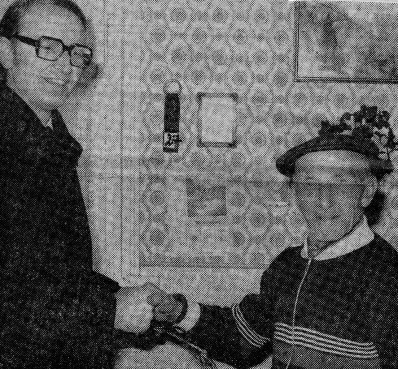 Zeitungsausschnitt: Am 27. Januar 1978 gratuliert Ortsbürgermeister Koch dem anerkannten und beliebten Mitbürger Moritz Schönberg zum 90. Geburtstag.