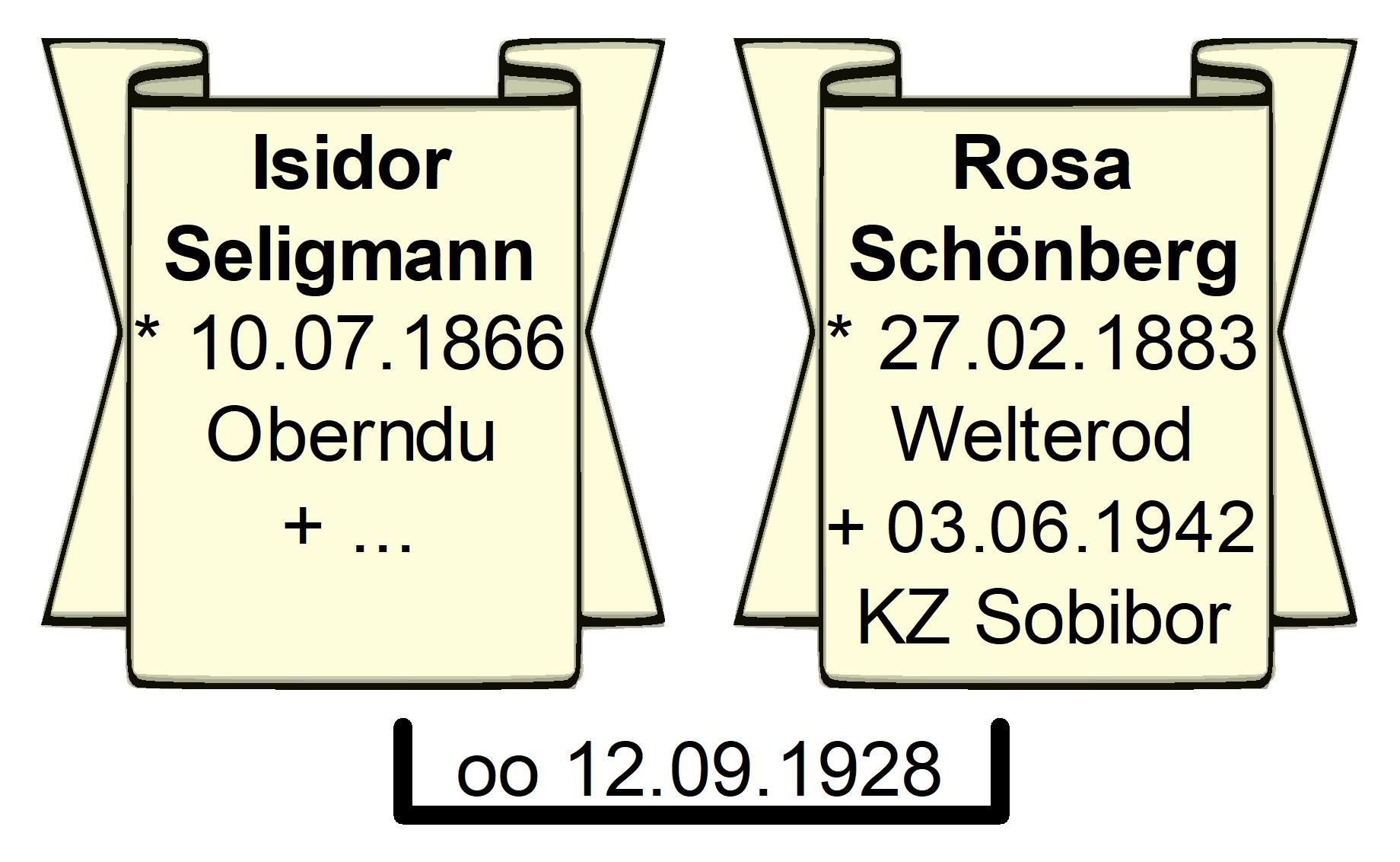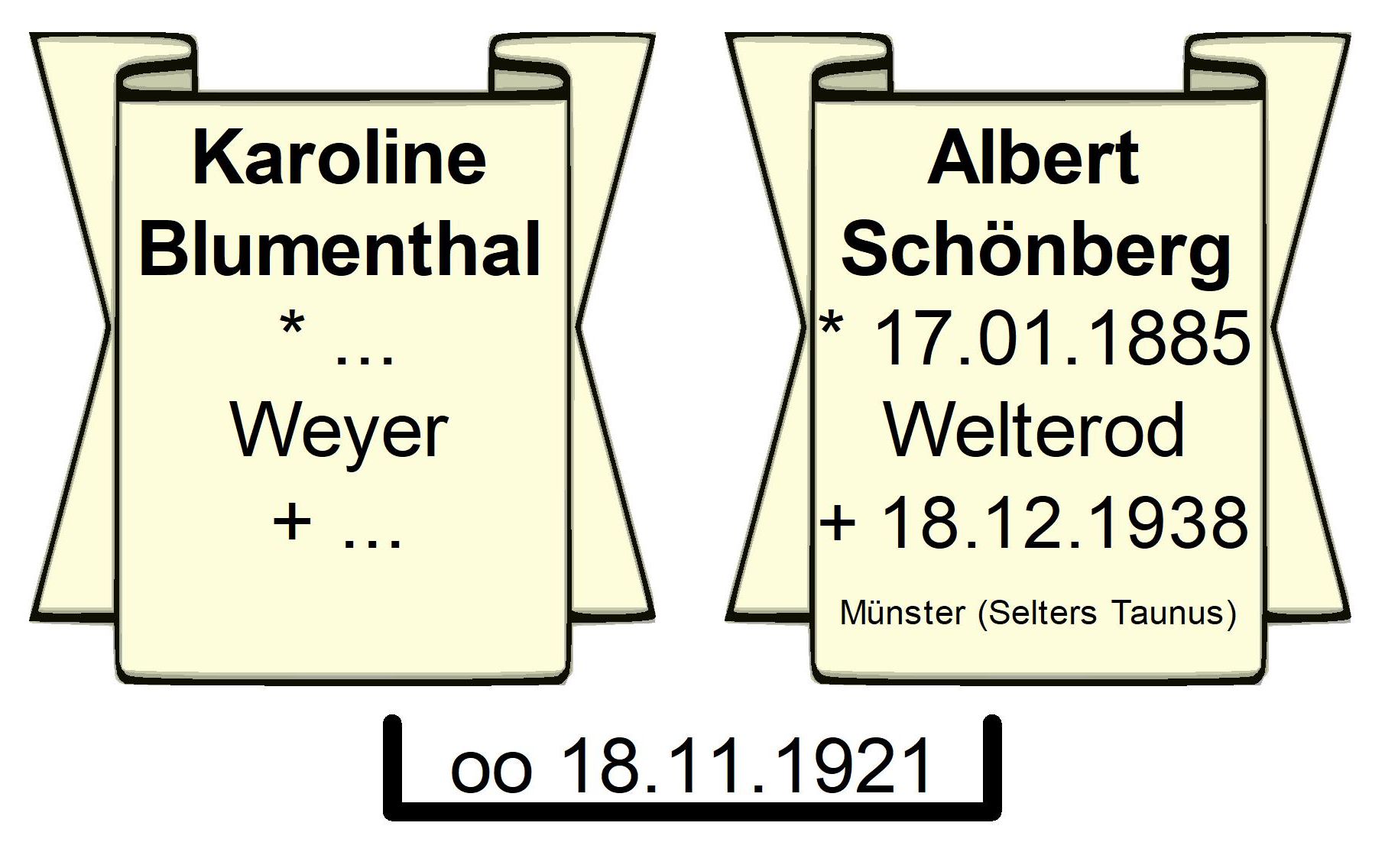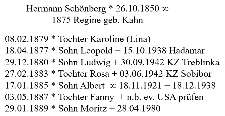 Der Großvater von Albert und Moritz Schönberg, Aron Schönberg, kaufte im Jahr 1851 das Haus Nr. 62 mit Stall und Scheune von Jakob Carl. Aron und später sein Sohn Hermann handelten mit Großvieh und betrieben eine koschere Metzgerei. Nach dem Tod des Vaters Hermann Schönberg, war ab 1916 der Sohn Albert *17. Januar 1885 Eigentümer 2 – 004.