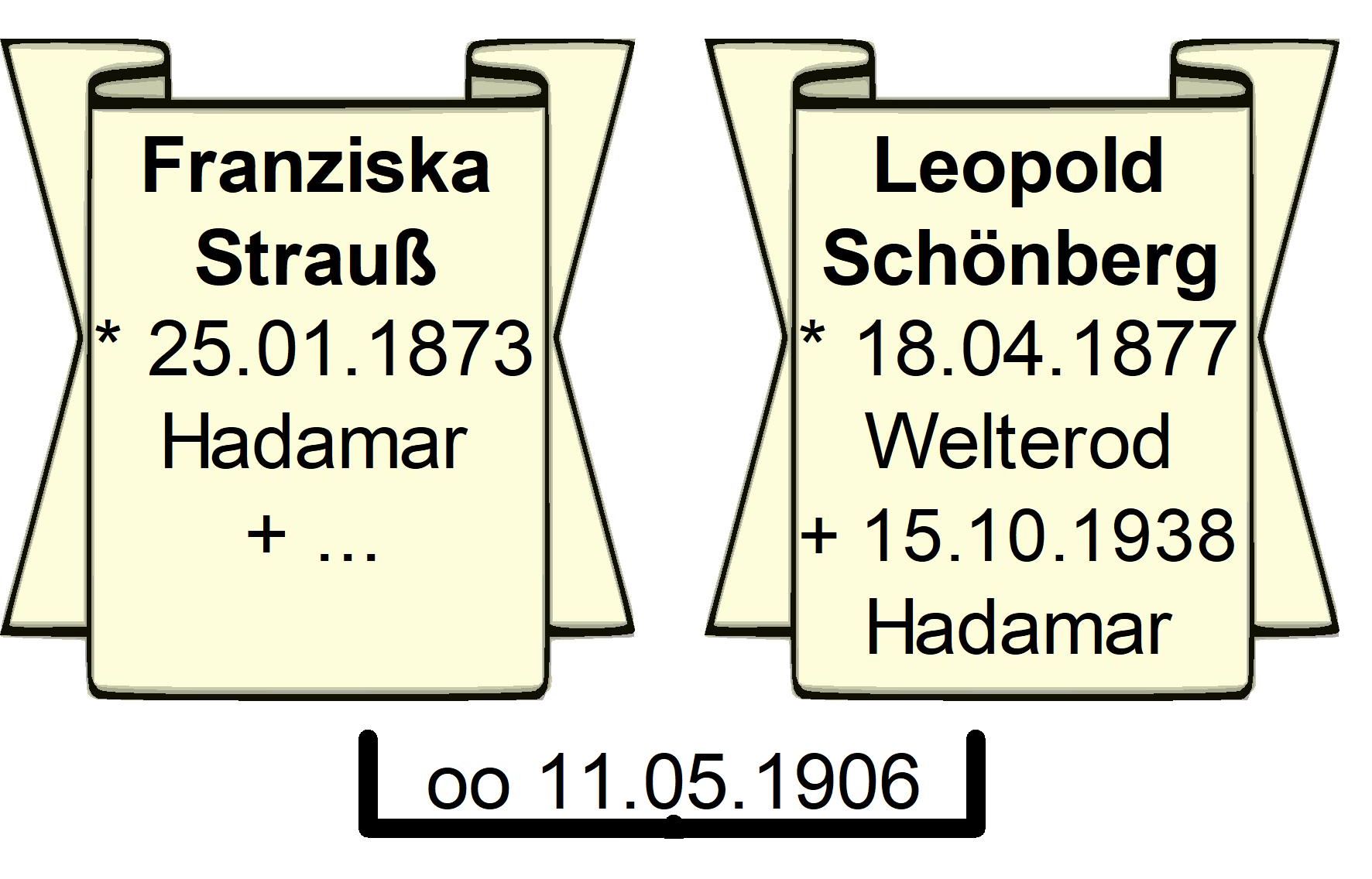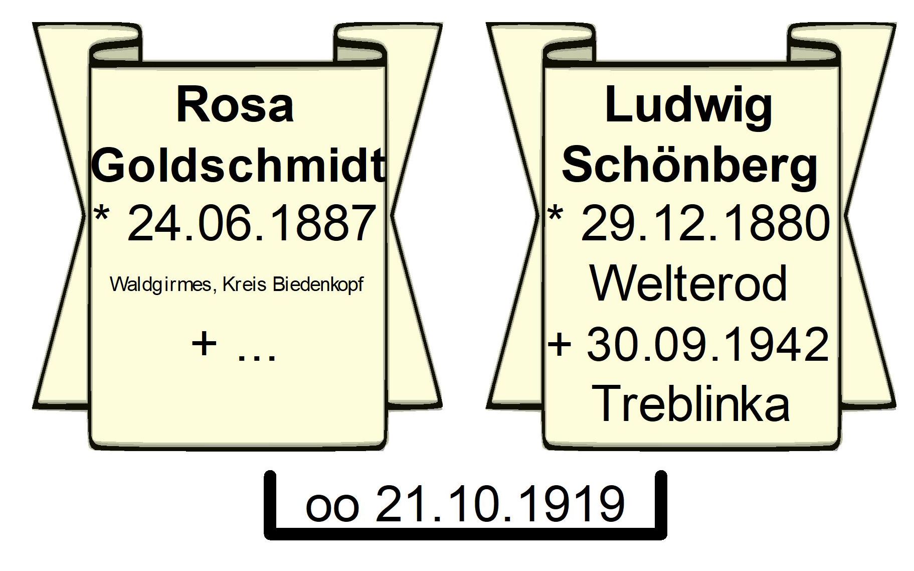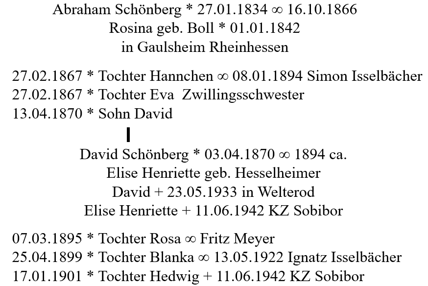 Abraham Schönberg kaufte 1865 das im Jahr 1860 von Förster Hubert Menges (+ 12.10.1865) erbaute Wohnhaus am damaligen unteren Ende des Dorfes in der Steinkaut (Heute Rheingaustraße 2). 2 – 011 Im Laufe der Jahre kamen Stall, Scheune und Anbauten dazu. Er betätigte sich als Viehhändler, Metzger und Landwirt. Im Jahr 1894 übernahmen David Schönberg mit seiner Frau Henriette die Anlage. 2 – 012 Bei David wird als Beruf Viehhändler und Landwirt angegeben. Ihr Hausname war „Afroms“, was möglicherweise auf den Ahnen Aron zurückzuführen ist. Außerdem war die Familie für ihren guten Handkäse bekannt, den sie herstellten und verkauften.