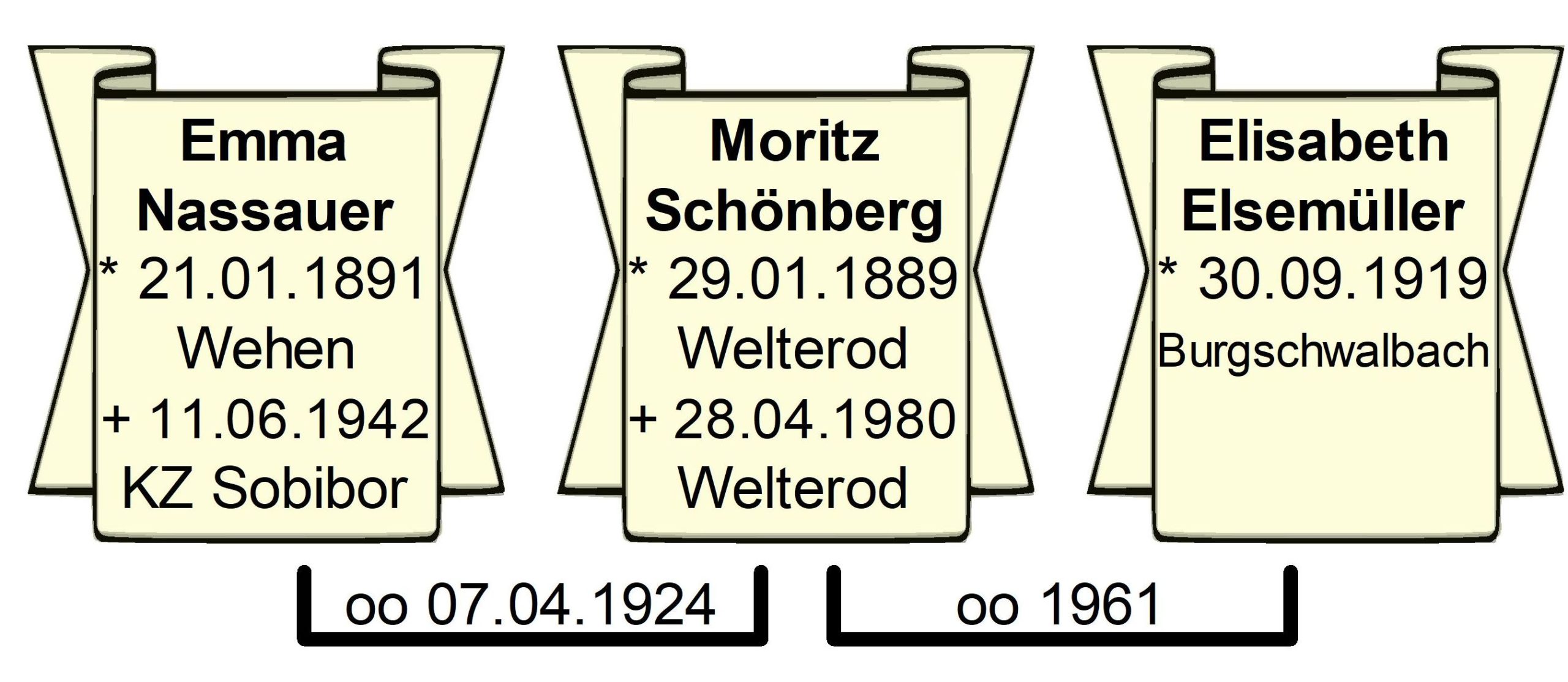 Moritz kam am 24. Julie 1952 wieder in seinem Heimatdorf Welterod an. Bis zum Kauf eines eigenen Hauses in der Ortsstraße Nr. 56a wohnte er als Mieter bei der Familie Back. In seinem alten Gewerbe, dem Handel mit Schlachtvieh sowie Tierhäuten und Tierhaaren, war der Heimkehrer wieder aktiv. 1961 heiratete Moritz Schönberg in 2. Ehe Elisabeth Elsemüller geboren am 30.09.1919 in Burgschwalbach.