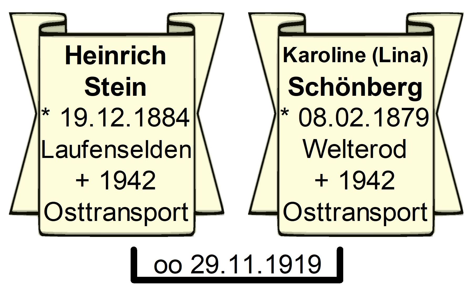 Das Ehepaar Stein wohnte zur Miete in verschiedenen Welteroder Häusern. Zeitweise in Nr. 56 zuletzt in Nr. 76 (Gemeindehaus). Es waren sehr arme Leute. Sie handelten im kleinen Umfang mit Schlachtvieh, Tierhäuten und verkauften Hefe.