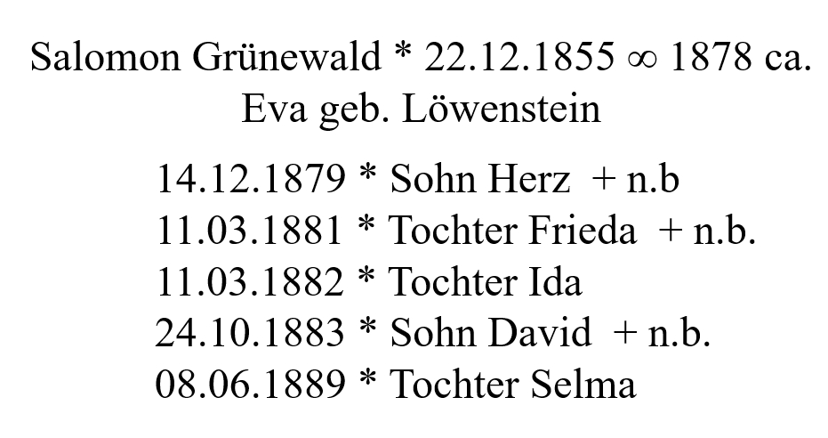 Die Familien Herz Grünewald und Liebmann Schönberg erweiterten im Jahr 1853 ihren Wohnbereich in der Gibgasse durch Kauf des Wohnhauses Nr. 45 (Heute Rathausstraße 11) von der Witwe Wilhelmine Back. 2 – 013 Deren Sohn Salomon Grüne-wald übernahm 1886 das Haus. Ab 1911 sind als Besitzer Tochter Selma und der Schwiegersohn Salomon Leopold mit seiner Frau Ida eingetragen.
